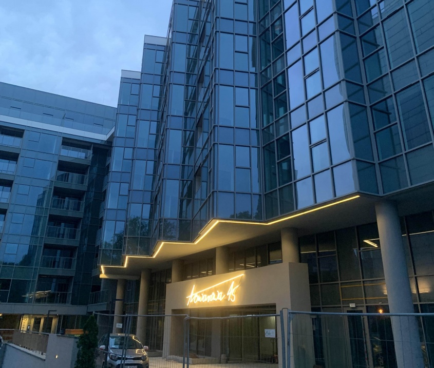 Kończy się budowa budynku mieszkalnego wielorodzinnego przy ulicy Towarowej 45. Na elewacji zaczynają pojawiać się detale. Jednym z najbardziej charakterystycznych z nich to odręcznie wykonany neon.